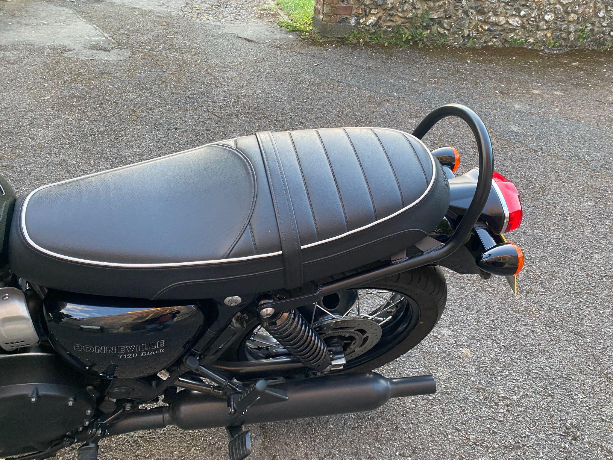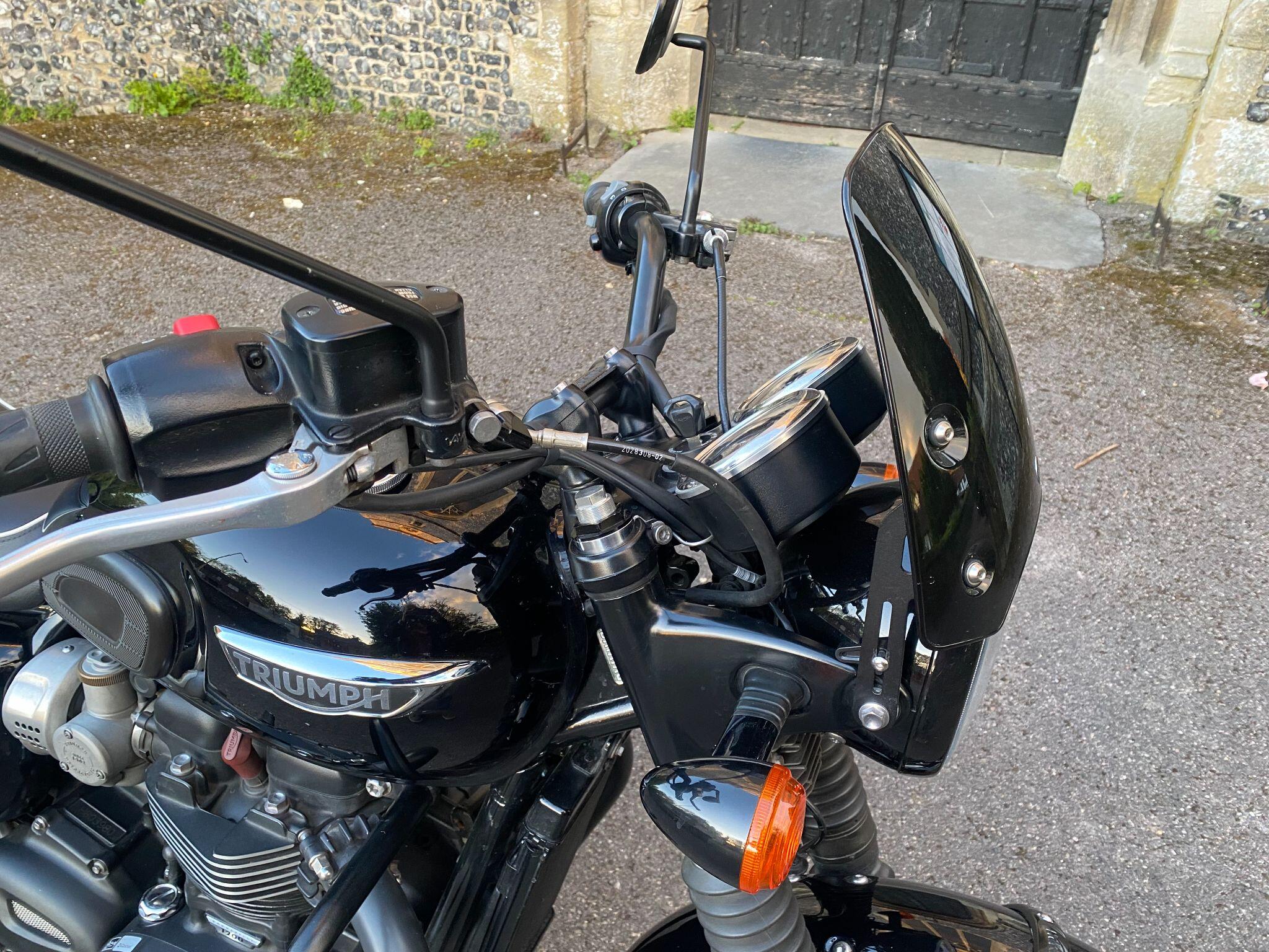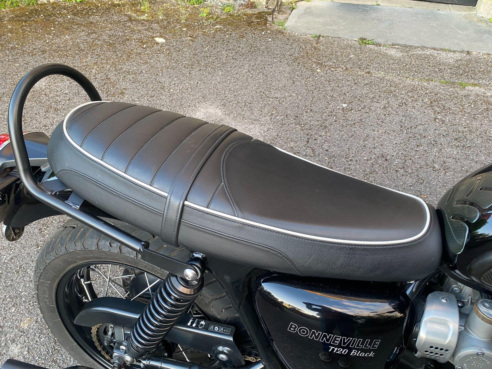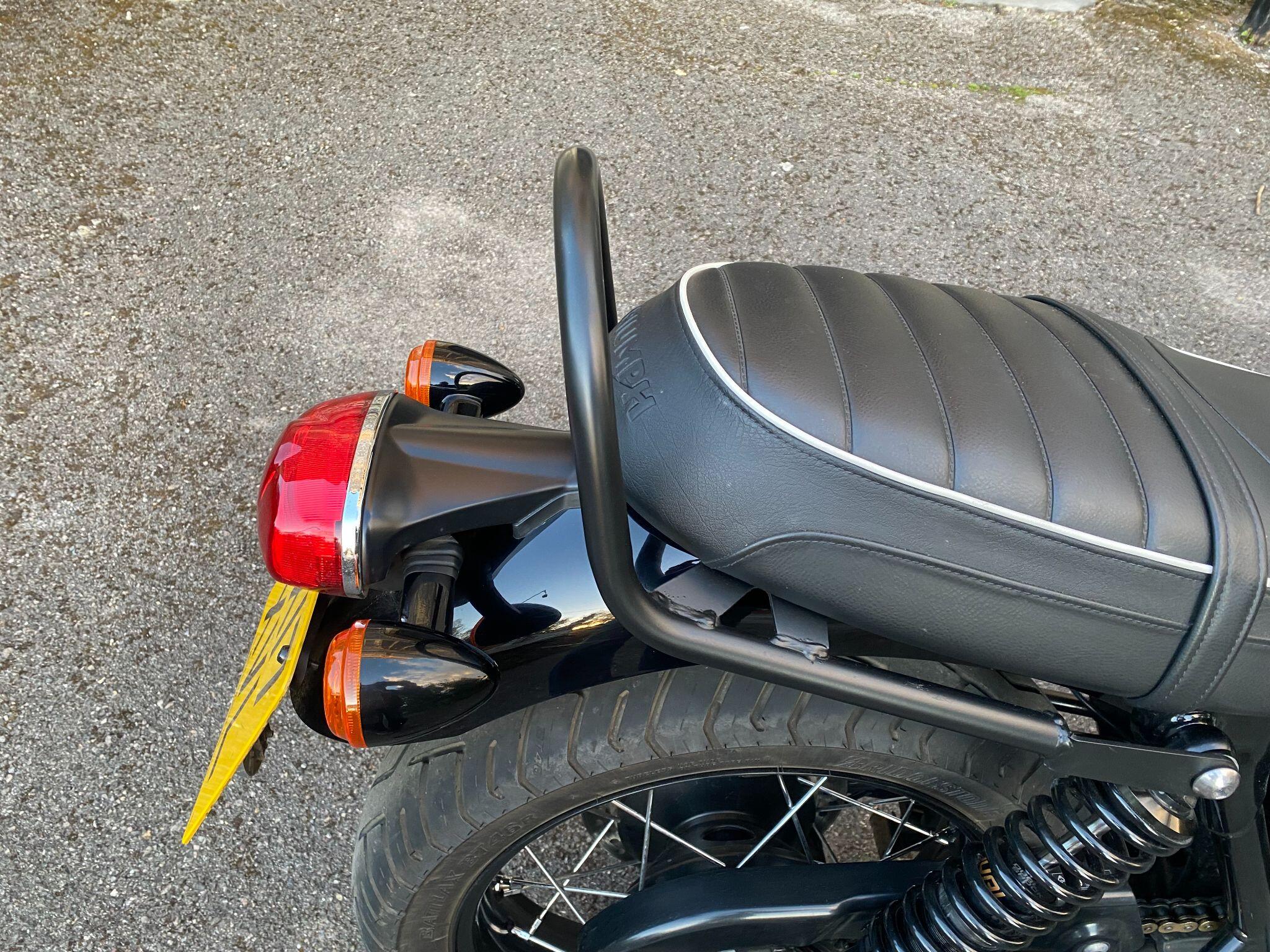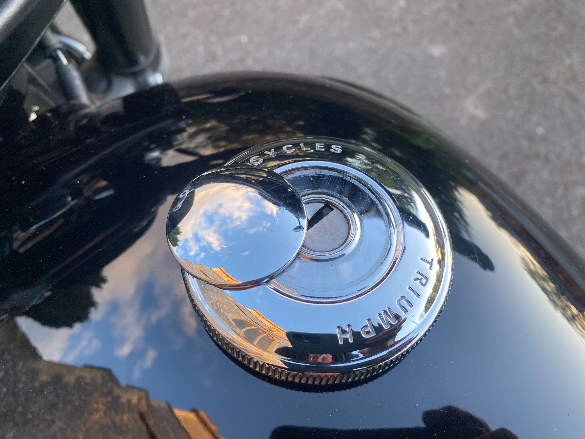 Fitted with Triumph heated grips, cruise control, Scottoiler, adjustable front forks, crash protection bars, locking chrome fuel cap, fender extender,f ork gaiters, Protech rear shocks, LSL flat track bars, pillion grab rail, Dart dark tinted fly screen, black retro style seat with piping and a centre stand for ease of maintainence.