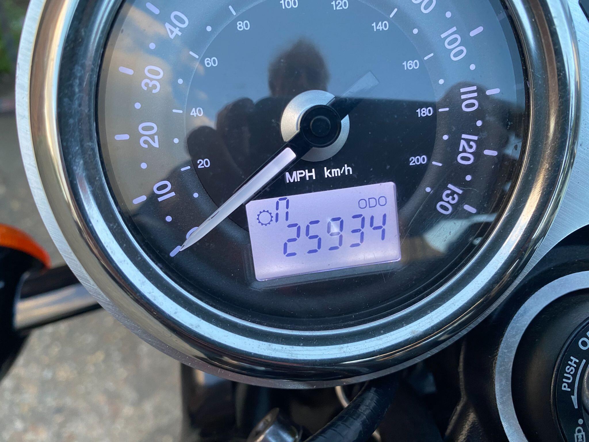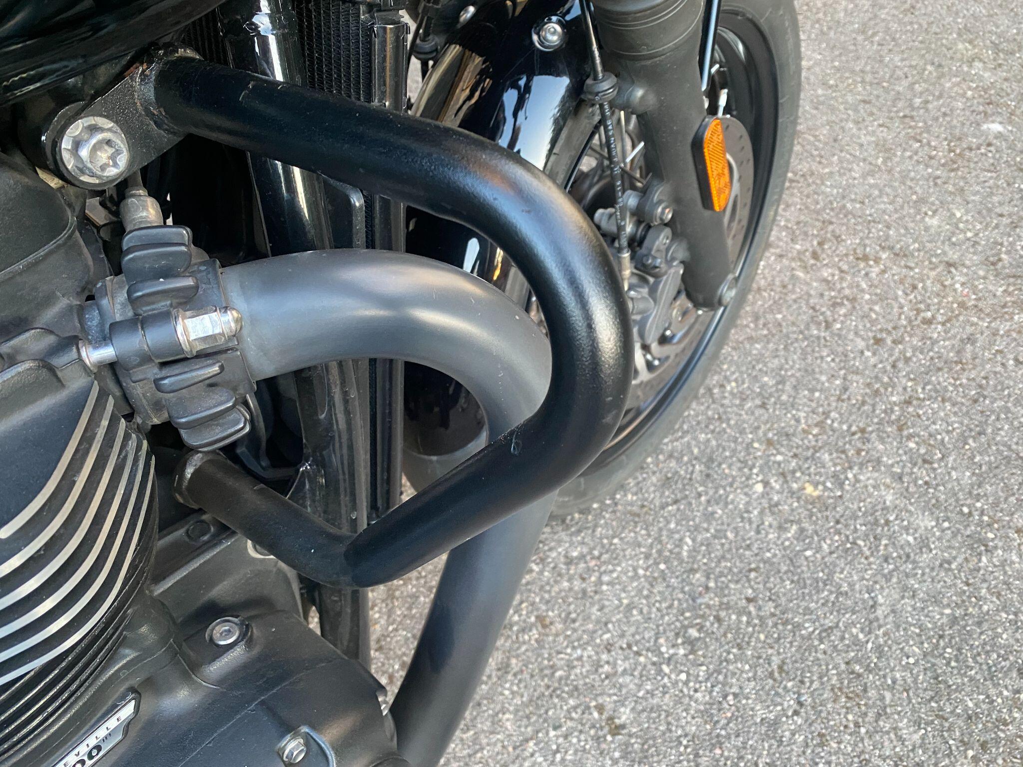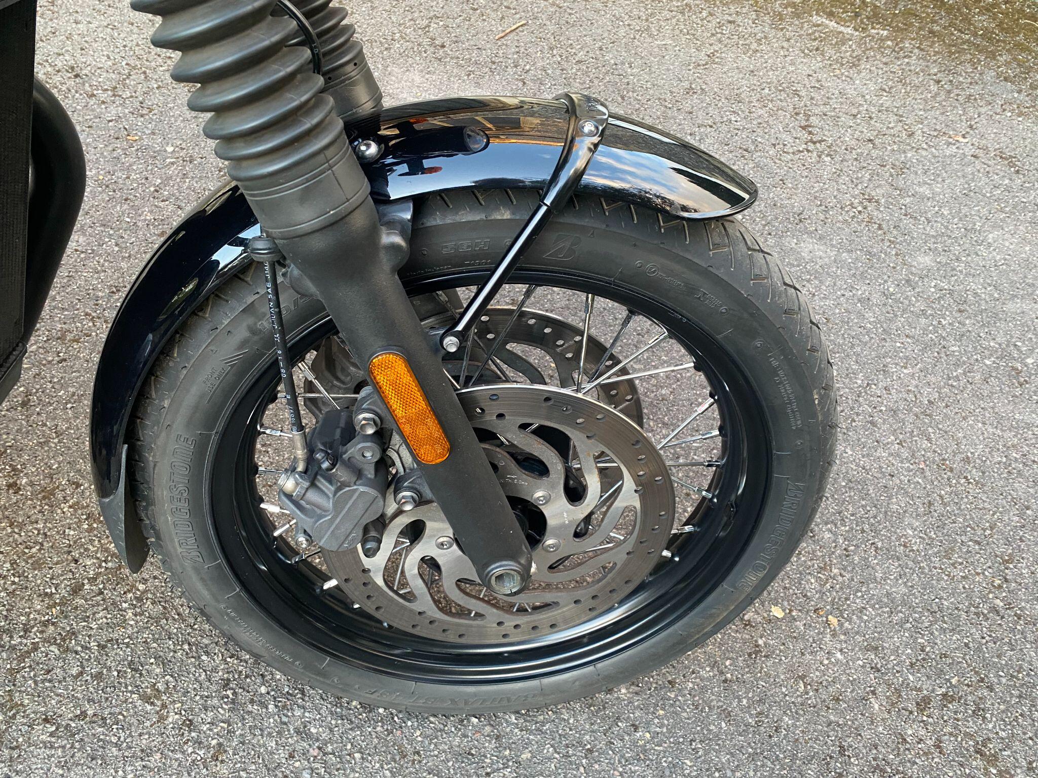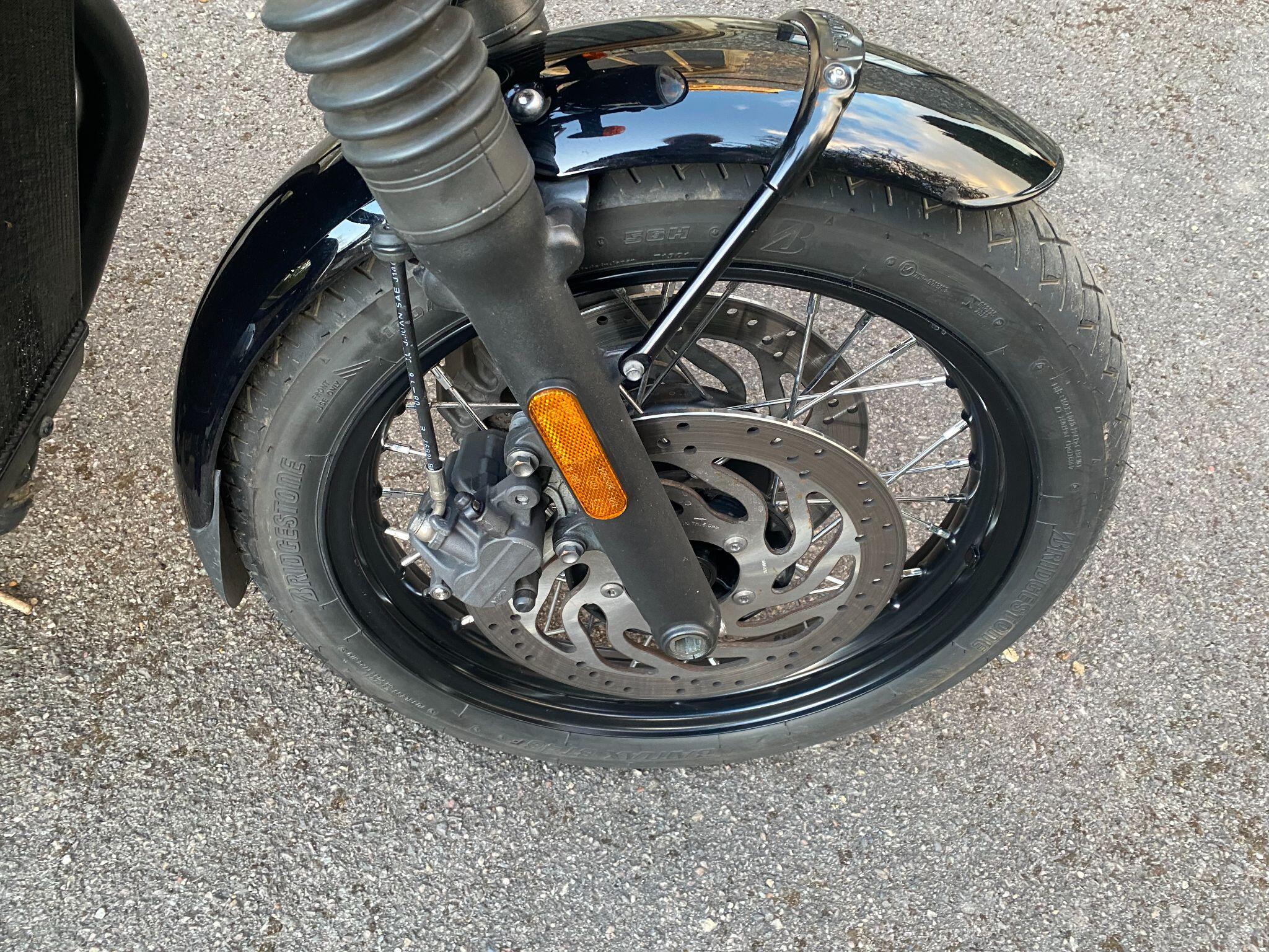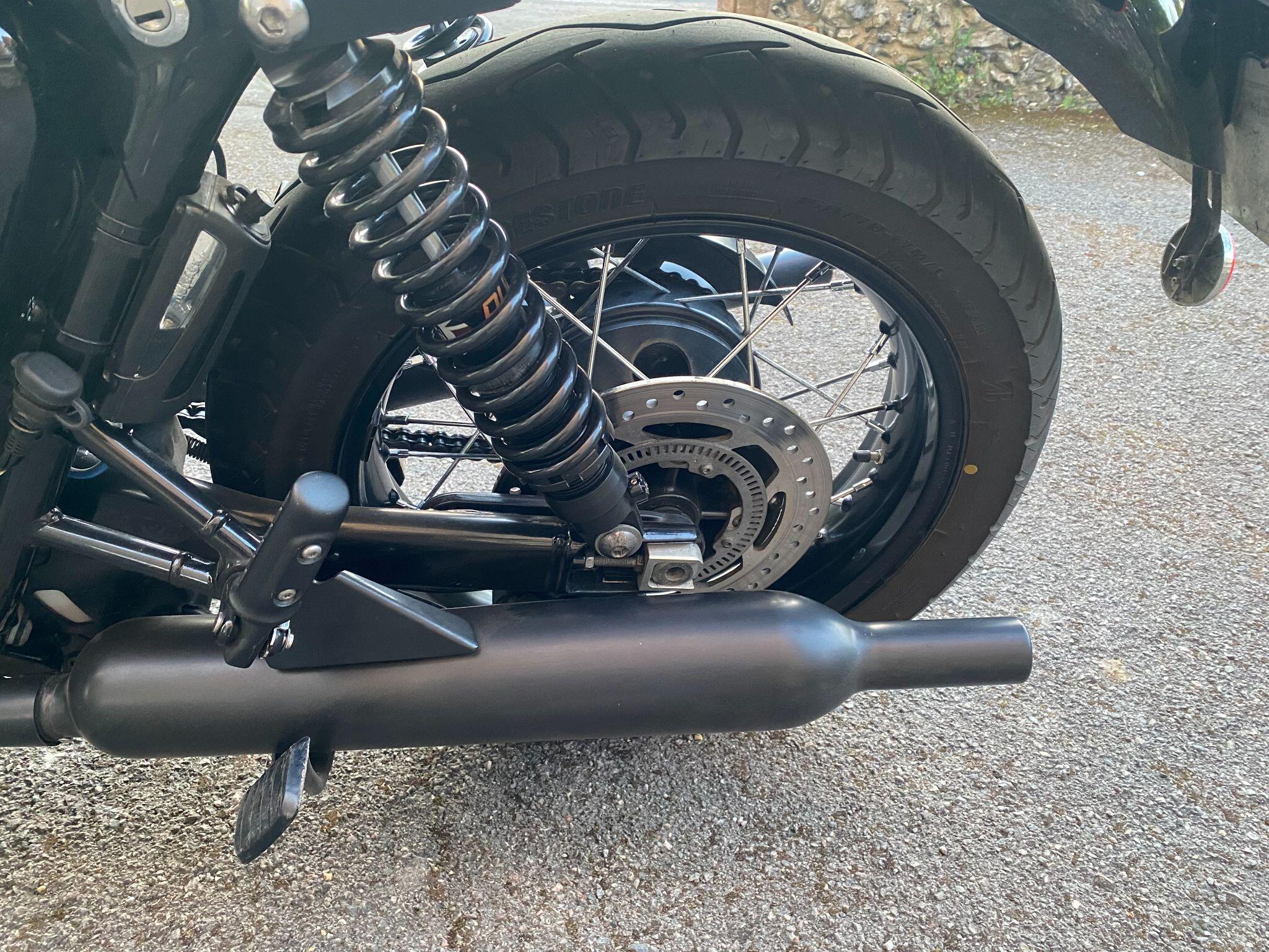 Fitted with Triumph heated grips, cruise control, Scottoiler, adjustable front forks, crash protection bars, locking chrome fuel cap, fender extender,f ork gaiters, Protech rear shocks, LSL flat track bars, pillion grab rail, Dart dark tinted fly screen, black retro style seat with piping and a centre stand for ease of maintainence.
